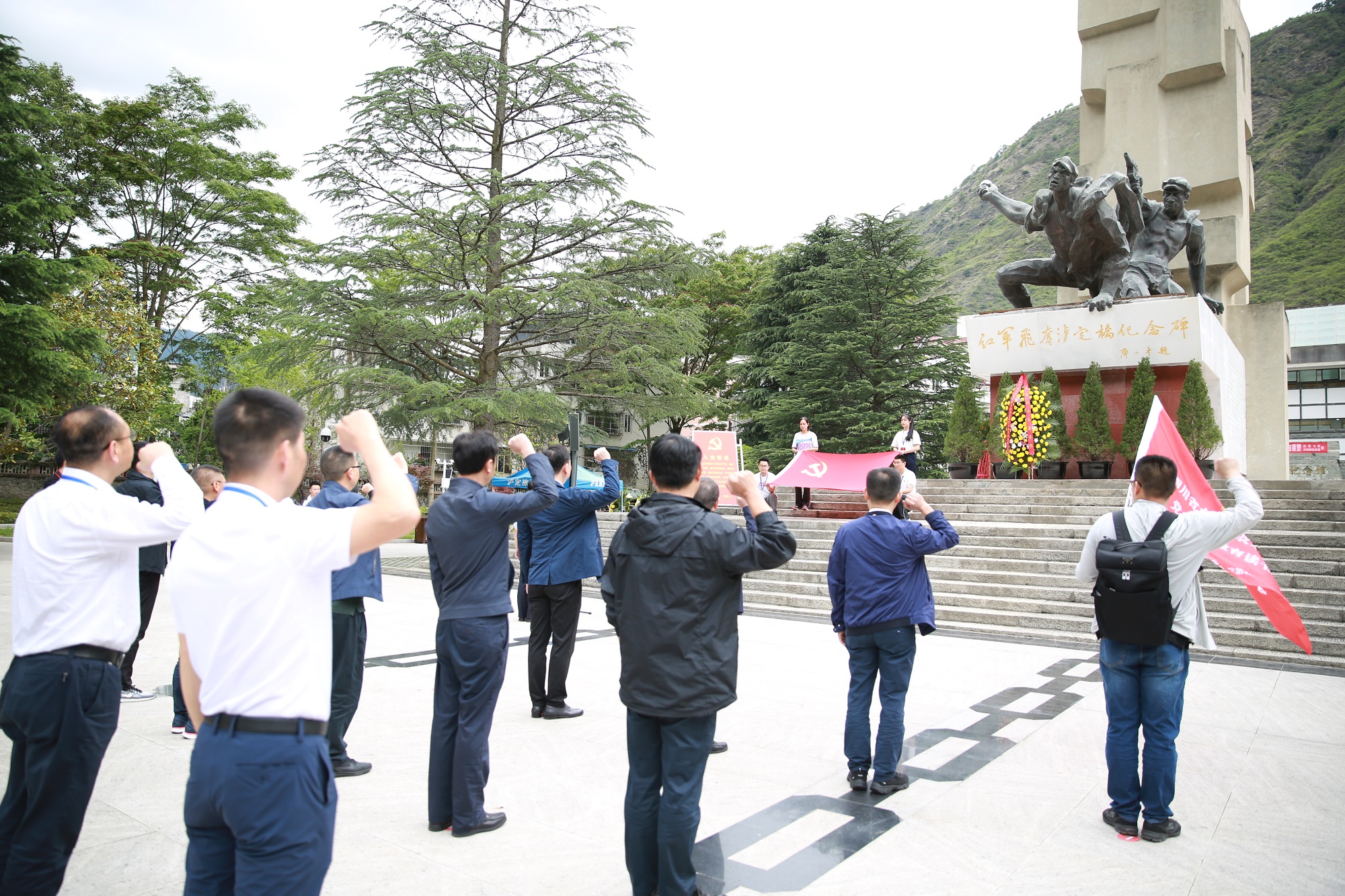 17:00,大家沿著大渡河邊行軍來到了紅軍飛奪瀘定橋紀念館。在雄偉的紀念館廣場紀念碑前,黨員們懷著無比崇敬的心情,聆聽英雄贊頌,向烈士敬獻花籃,重溫入黨誓詞。緊接著參觀了紅軍飛奪瀘定橋紀念館。大家緊隨解說員,認真聆聽學習,了解相關歷史背景,學習革命史。館內豐富的圖文資料,珍貴的藏品,讓黨員們深切感受到革命先烈的堅定信念和大無畏精神。
