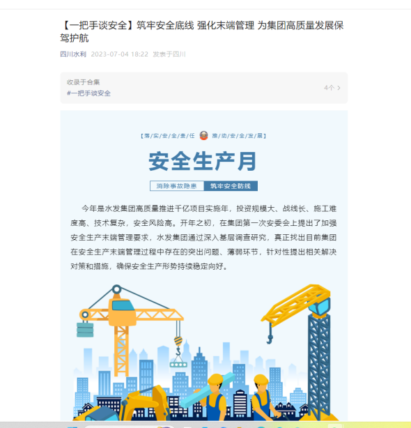 圖:集團黨委書記、董事長、安委會主任鐘杰在“四川水利”公眾號發表了題為《筑牢安全底線 強化末端管理 為集團高質量發展保駕護航》的署名文章