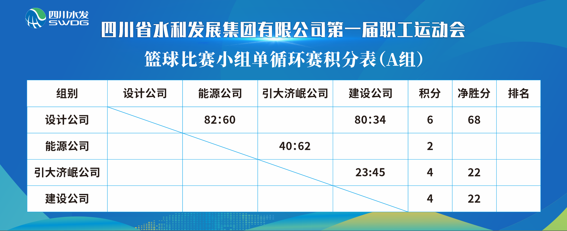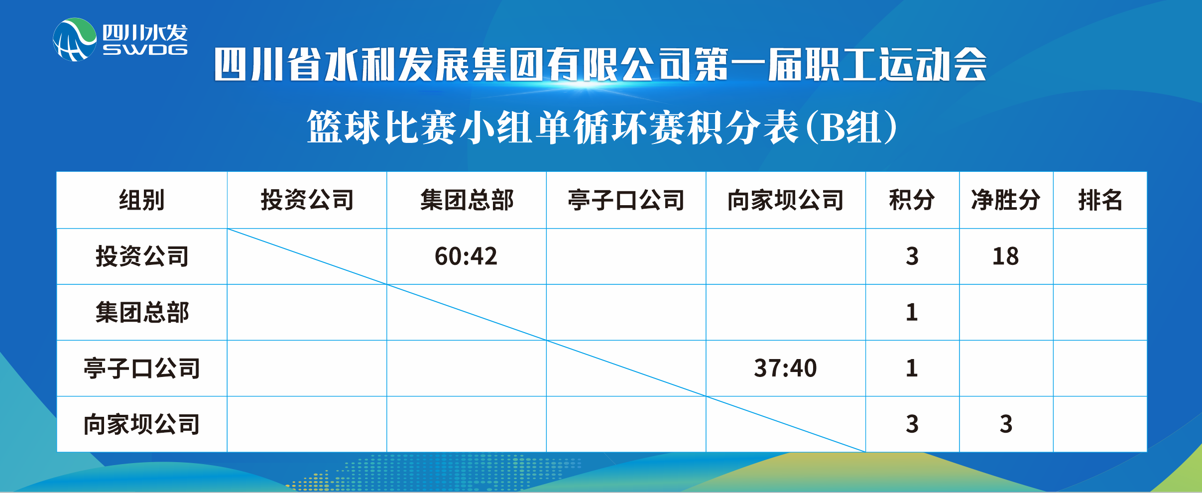 12月5日上午9時(shí),隨著裁判的一聲哨響,集團(tuán)第一屆職工運(yùn)動會預(yù)賽階段正式開始,首先開賽的是集團(tuán)總部對陣投資公司和設(shè)計(jì)公司對陣能源公司的籃球小組循環(huán)賽,未來3天,8支籃球隊(duì)將爭奪4個(gè)進(jìn)入排位賽的名額。賽前,集團(tuán)黨委委員、工會主席唐克飛前往成都市水井坊錦江體育公園為參賽運(yùn)動員加油鼓勁。賽場上水發(fā)健兒你追我趕,傳球、防守、運(yùn)球、擋拆、上籃……對戰(zhàn)雙方開啟了緊張的進(jìn)攻模式,比分交替上升,精彩瞬間讓人目不暇接,贏得全場觀眾陣陣掌聲。