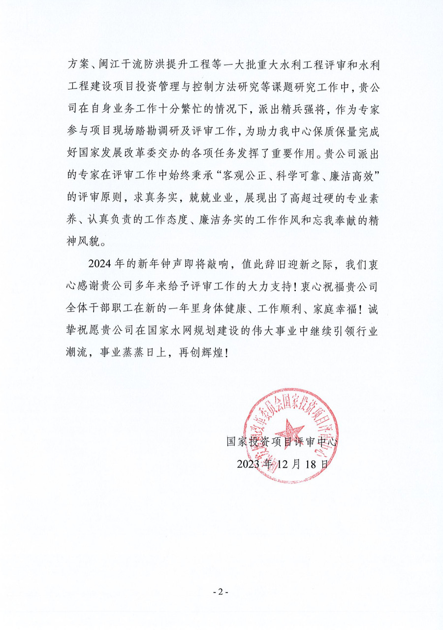近日,國家發(fā)展改革委國家投資項目評審中心向四川水發(fā)設(shè)計公司發(fā)來感謝信。感謝信指出:近幾年,該公司在自身業(yè)務(wù)工作十分繁忙的情況下,派出精兵強將積極參與國家投資項目評審中心組織的一大批重大水利工程評審工作,在助力中心保質(zhì)保量完成好國家發(fā)展改革委交辦的各項任務(wù)發(fā)揮了重要作用。