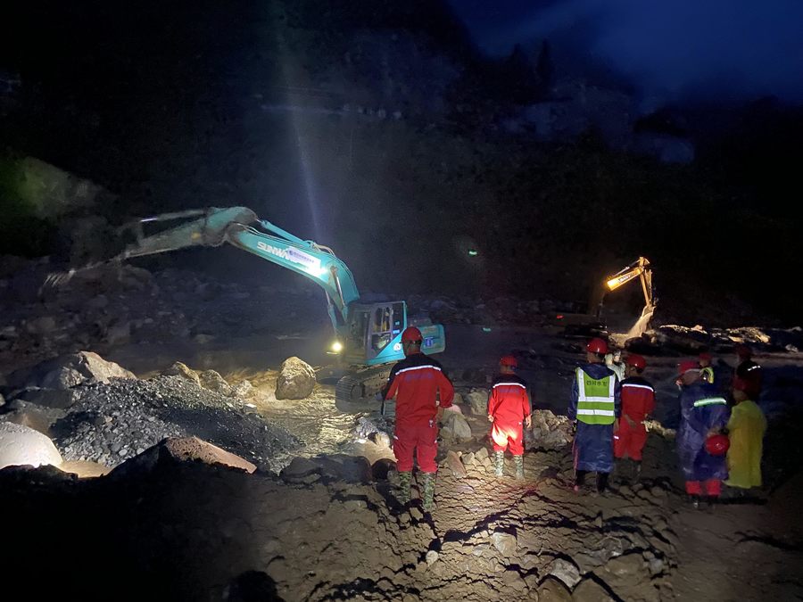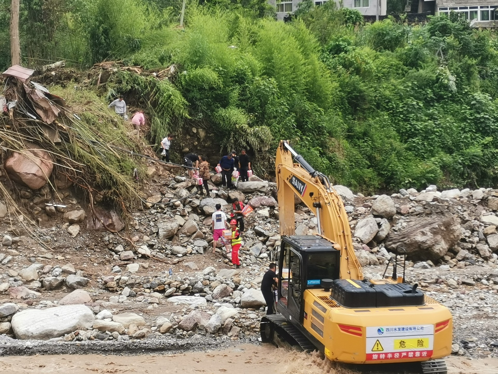 “時間就是生命!”應(yīng)急搶險突擊隊的兩名現(xiàn)場指揮均參加過“5·12”汶川地震搶險工作,他們深知在大災(zāi)大難面前,搶時間就是搶生命。山路坡陡彎急、崎嶇狹窄,加之狂風(fēng)暴雨、碎石滾落,應(yīng)急搶險隊決定分批輕裝前行。第一批隊員攜6 臺挖掘機、3臺裝載機于6時50分抵達馬烈鄉(xiāng)新華村。9時左右,68名隊員集結(jié)完畢。“就靠你們了啊!”漢源縣人民政府黨組成員、副指揮長李樹敏強壓著悲痛對第一支進駐搶險現(xiàn)場的四川水發(fā)應(yīng)急搶險突擊隊分配搶險任務(wù)。