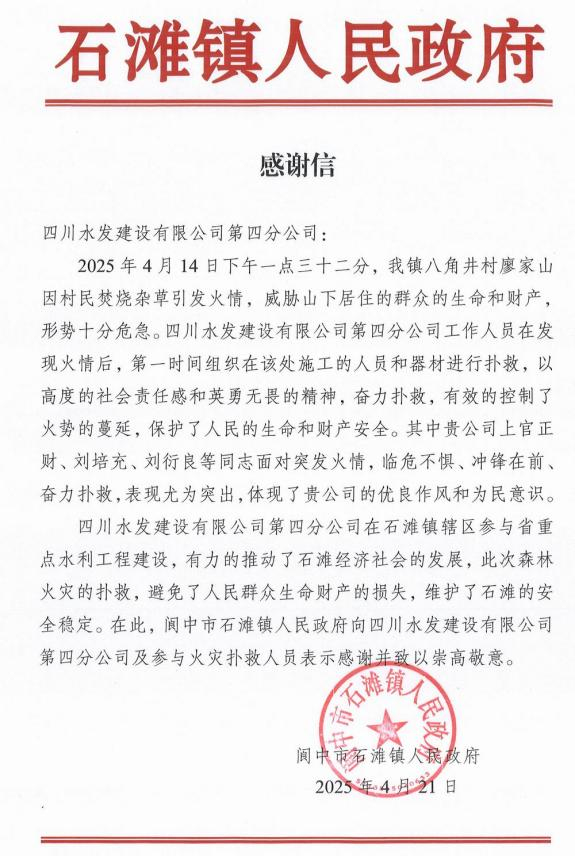 前不久,閬中市石灘鎮(zhèn)八角井村廖家山因村民焚燒雜草突發(fā)火情,火勢兇猛,迅速向民宅蔓延,情況萬分危急。建設(shè)公司四分公司青年突擊隊(duì)聞令而動(dòng),化身逆火而行的“鋼鐵戰(zhàn)士”,攜帶滅火器材奔赴火場。面對(duì)熊熊烈火,他們無畏無懼,手持鐵鍬、鋼鏟奮力清理可燃物,于上風(fēng)口處奮勇?lián)浯蛎骰穑会槍?duì)火勢較大區(qū)域,熟練使用滅火器進(jìn)行重點(diǎn)攻堅(jiān),并安排專人嚴(yán)密巡查,杜絕復(fù)燃隱患。在這場與時(shí)間賽跑、與烈火較量的戰(zhàn)斗中,青年突擊隊(duì)以專業(yè)的救援能力和頑強(qiáng)的拼搏精神,成功控制火情,為保障群眾生命財(cái)產(chǎn)安全筑起堅(jiān)實(shí)防線,用實(shí)際行動(dòng)詮釋了“水利鐵軍”不畏艱險(xiǎn)、沖鋒在前的奉獻(xiàn)擔(dān)當(dāng),贏得了閬中市石灘鎮(zhèn)人民政府的高度贊譽(yù)與真摯感謝。